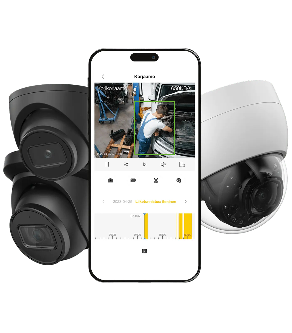 Kameravalvontamme takaa mielenrauhan – tarkkaa ja luotettavaa valvontaa kaikissa olosuhteissa, myös pimeässä. Älykäs tunnistus havaitsee ihmiset ja ajoneuvot, ja jopa 90 päivän tallennus varmistaa, ettei mikään jää huomaamatta. Käytä helposti paikallisesti tai etänä ja saa hälytykset poikkeamista reaaliajassa. Huolto- ja ylläpitopalvelu kuuluu aina hintaan.